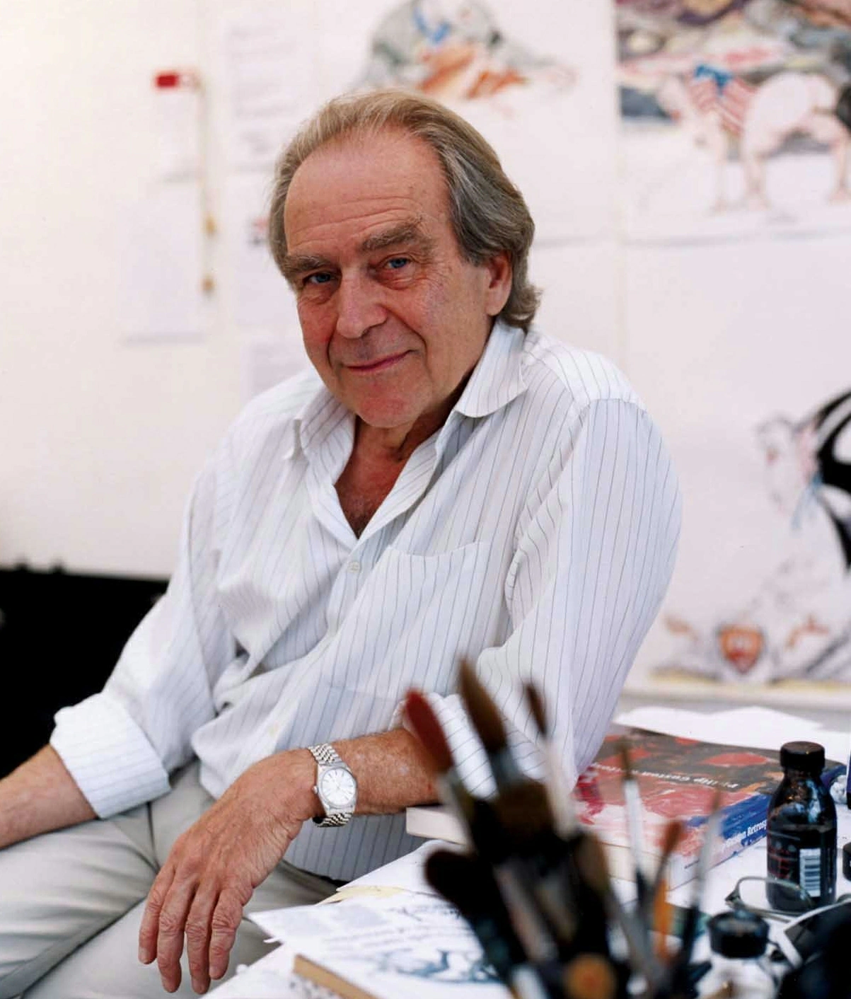 Scarfe's art begins with a premise about truth: that the public mask is never the whole face. His caricatures distort not to lie, but to reveal - turning vanity into obesity, aggression into weaponry, hypocrisy into a grin stretched too far. The line is quick and abrasive, often scratchy, as if speed were an ethical necessity: the drawing must land before the official story hardens. Even when he designs for entertainment, his figures tend to look pressured by the world around them, as if the air itself were political.The deepest motor in Scarfe's work is early fear carried into adulthood and refashioned as critique. He repeatedly returned to wartime childhood sensations - the body made small, instructed, and threatened - and translated them into images of crowds herded, minds regimented, and leaders enlarged to monstrous scale. "All the children had to wear a gas mask in case of a gas attack by the Germans. They tried to make the masks like Mickey Mouse faces so the children would like them. But I didn't. They had big ears on them". That memory is not anecdote; it is a template for his recurring motif of the human turned into an object, a face redesigned to soothe fear while deepening it. In The Wall, he found an equivalent visual chorus for that trauma: "And having suffered for part of the war when I was a child. I was too young to really understand what was going on but one of my favorite pieces of animation now is that Goodbye Blue Sky in The Wall because that deals directly with that period in time". His anti-war stance was not fashionable pacifism but lived recoil, extended by later witnessing: "I have been to several wars to draw. I went to Vietnam. And made drawings in Vietnam during that period of the war there, and found that to be a very very sad situation". Legacy and Influence