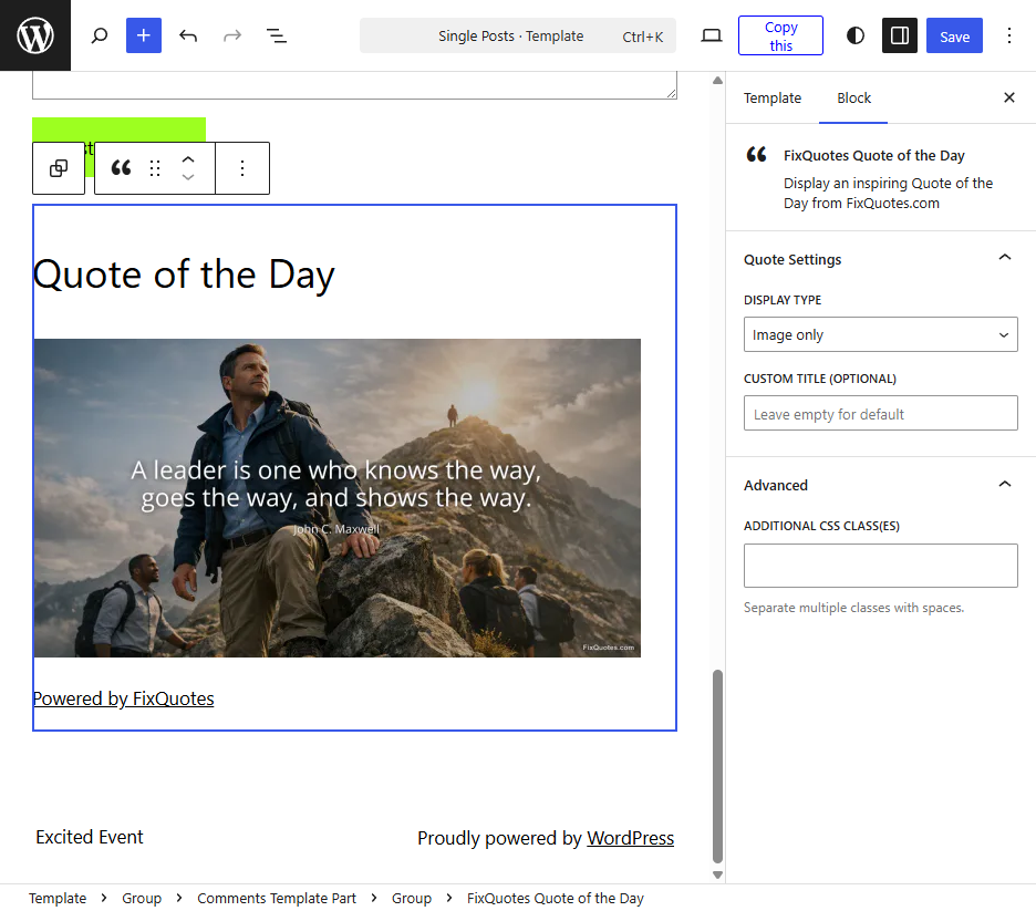 Native block editor support for WordPress 5.0+. Add quotes anywhere in your posts and pages with a dedicated Gutenberg block.