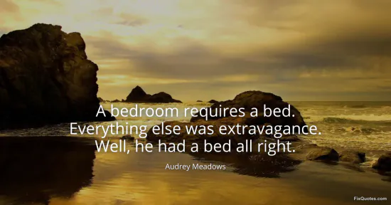 Meadows, Audrey. "A bedroom requires a bed. Everything else was extravagance. Well, he had a bed all right." FixQuotes. January 17, 2026. https://fixquotes.com/quotes/a-bedroom-requires-a-bed-everything-else-was-37554/.