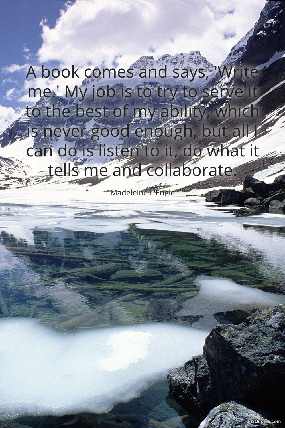 L'Engle, Madeleine. (2026, February 16). A book comes and says, 'Write me.' My job is to try to serve it to the best of my ability, which is never good enough, but all I can do is listen to it, do what it tells me and collaborate. FixQuotes. https://fixquotes.com/quotes/a-book-comes-and-says-write-me-my-job-is-to-try-134113/