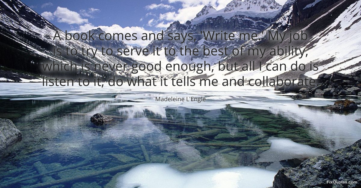 L'Engle, Madeleine. "A book comes and says, 'Write me.' My job is to try to serve it to the best of my ability, which is never good enough, but all I can do is listen to it, do what it tells me and collaborate." FixQuotes. February 16, 2026. https://fixquotes.com/quotes/a-book-comes-and-says-write-me-my-job-is-to-try-134113/.