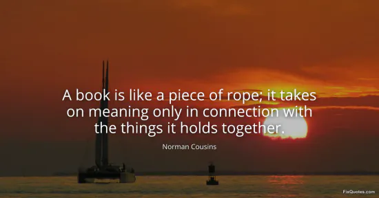 Cousins, Norman. "A book is like a piece of rope; it takes on meaning only in connection with the things it holds together." FixQuotes. January 15, 2026. https://fixquotes.com/quotes/a-book-is-like-a-piece-of-rope-it-takes-on-108712/.