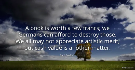 Scofield, Paul. "A book is worth a few francs; we Germans can afford to destroy those. We all may not appreciate artistic merit, but cash value is another matter." FixQuotes. January 15, 2026. https://fixquotes.com/quotes/a-book-is-worth-a-few-francs-we-germans-can-159440/.