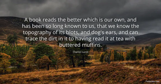 Lamb, Charles. (2026, January 17). A book reads the better which is our own, and has been so long known to us, that we know the topography of its blots, and dog's ears, and can trace the dirt in it to having read it at tea with buttered muffins. FixQuotes. https://fixquotes.com/quotes/a-book-reads-the-better-which-is-our-own-and-has-49810/