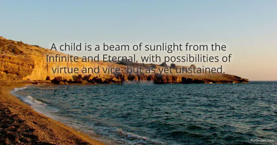 "A child is a beam of sunlight from the Infinite and Eternal, with possibilities of virtue and vice- but as yet unstained." FixQuotes, 14 Jan. 2026, https://fixquotes.com/quotes/a-child-is-a-beam-of-sunlight-from-the-infinite-63631/. Accessed 12 Feb. 2026.