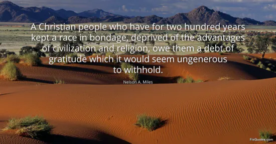 Miles, Nelson A. "A Christian people who have for two hundred years kept a race in bondage, deprived of the advantages of civilization and religion, owe them a debt of gratitude which it would seem ungenerous to withhold." FixQuotes. January 17, 2026. https://fixquotes.com/quotes/a-christian-people-who-have-for-two-hundred-years-64521/.