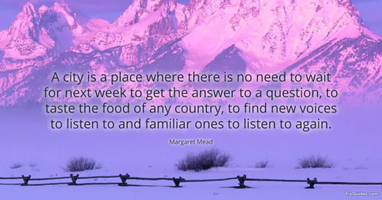 Mead, Margaret. (2026, January 18). A city is a place where there is no need to wait for next week to get the answer to a question, to taste the food of any country, to find new voices to listen to and familiar ones to listen to again. FixQuotes. https://fixquotes.com/quotes/a-city-is-a-place-where-there-is-no-need-to-wait-14813/