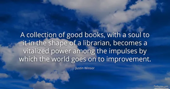 Winsor, Justin. "A collection of good books, with a soul to it in the shape of a librarian, becomes a vitalized power among the impulses by which the world goes on to improvement." FixQuotes. January 16, 2026. https://fixquotes.com/quotes/a-collection-of-good-books-with-a-soul-to-it-in-107236/.