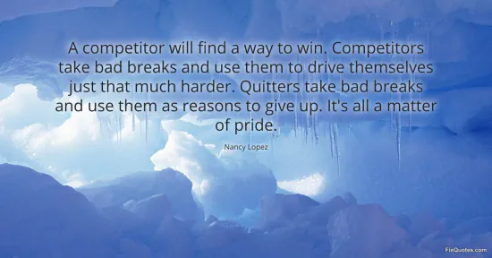 Lopez, Nancy. "A competitor will find a way to win. Competitors take bad breaks and use them to drive themselves just that much harder. Quitters take bad breaks and use them as reasons to give up. It's all a matter of pride." FixQuotes. January 16, 2026. https://fixquotes.com/quotes/a-competitor-will-find-a-way-to-win-competitors-128078/.