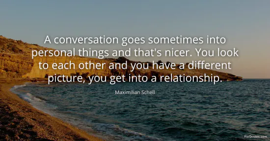 Schell, Maximilian. (2026, January 16). A conversation goes sometimes into personal things and that's nicer. You look to each other and you have a different picture, you get into a relationship. FixQuotes. https://fixquotes.com/quotes/a-conversation-goes-sometimes-into-personal-108208/