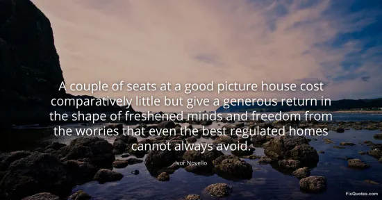 Novello, Ivor. (2026, January 17). A couple of seats at a good picture house cost comparatively little but give a generous return in the shape of freshened minds and freedom from the worries that even the best regulated homes cannot always avoid. FixQuotes. https://fixquotes.com/quotes/a-couple-of-seats-at-a-good-picture-house-cost-55624/