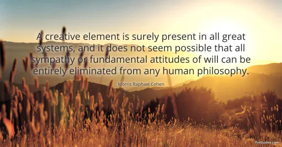 Cohen, Morris Raphael. (2026, January 15). A creative element is surely present in all great systems, and it does not seem possible that all sympathy or fundamental attitudes of will can be entirely eliminated from any human philosophy. FixQuotes. https://fixquotes.com/quotes/a-creative-element-is-surely-present-in-all-great-164303/