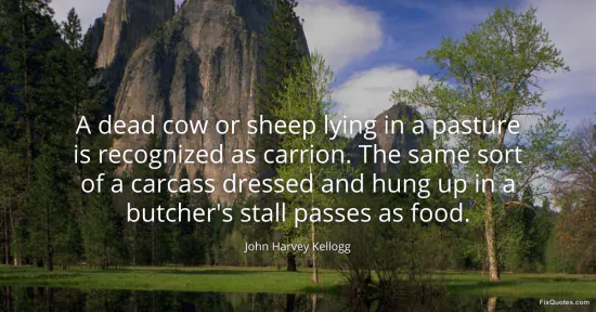 Kellogg, John Harvey. (2026, January 16). A dead cow or sheep lying in a pasture is recognized as carrion. The same sort of a carcass dressed and hung up in a butcher's stall passes as food. FixQuotes. https://fixquotes.com/quotes/a-dead-cow-or-sheep-lying-in-a-pasture-is-98286/
