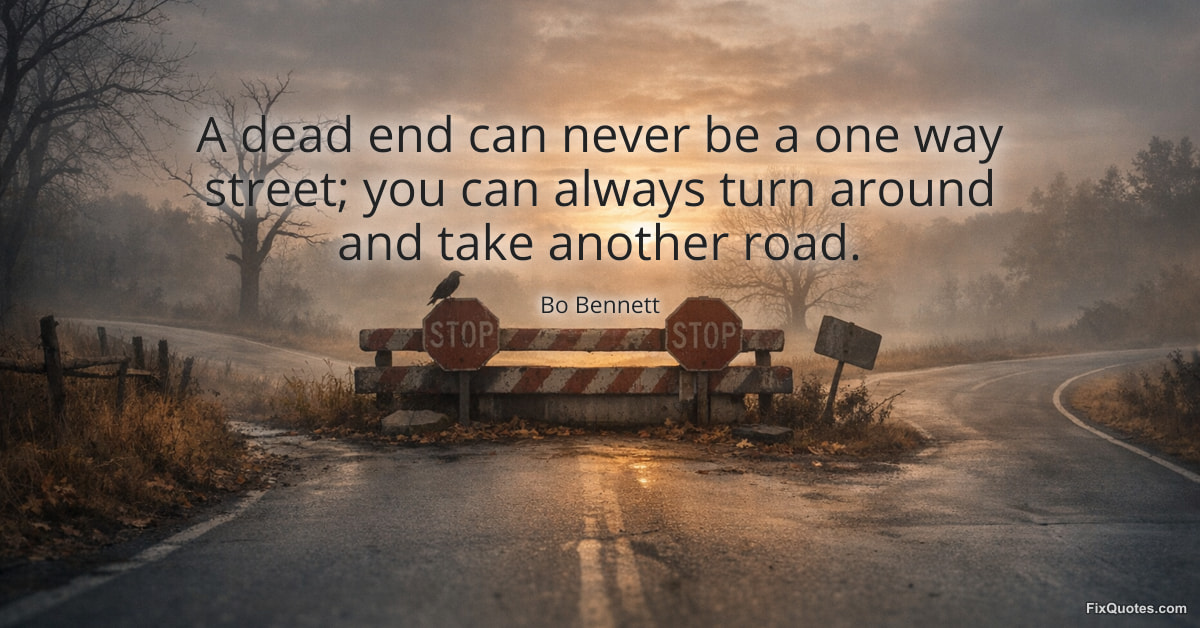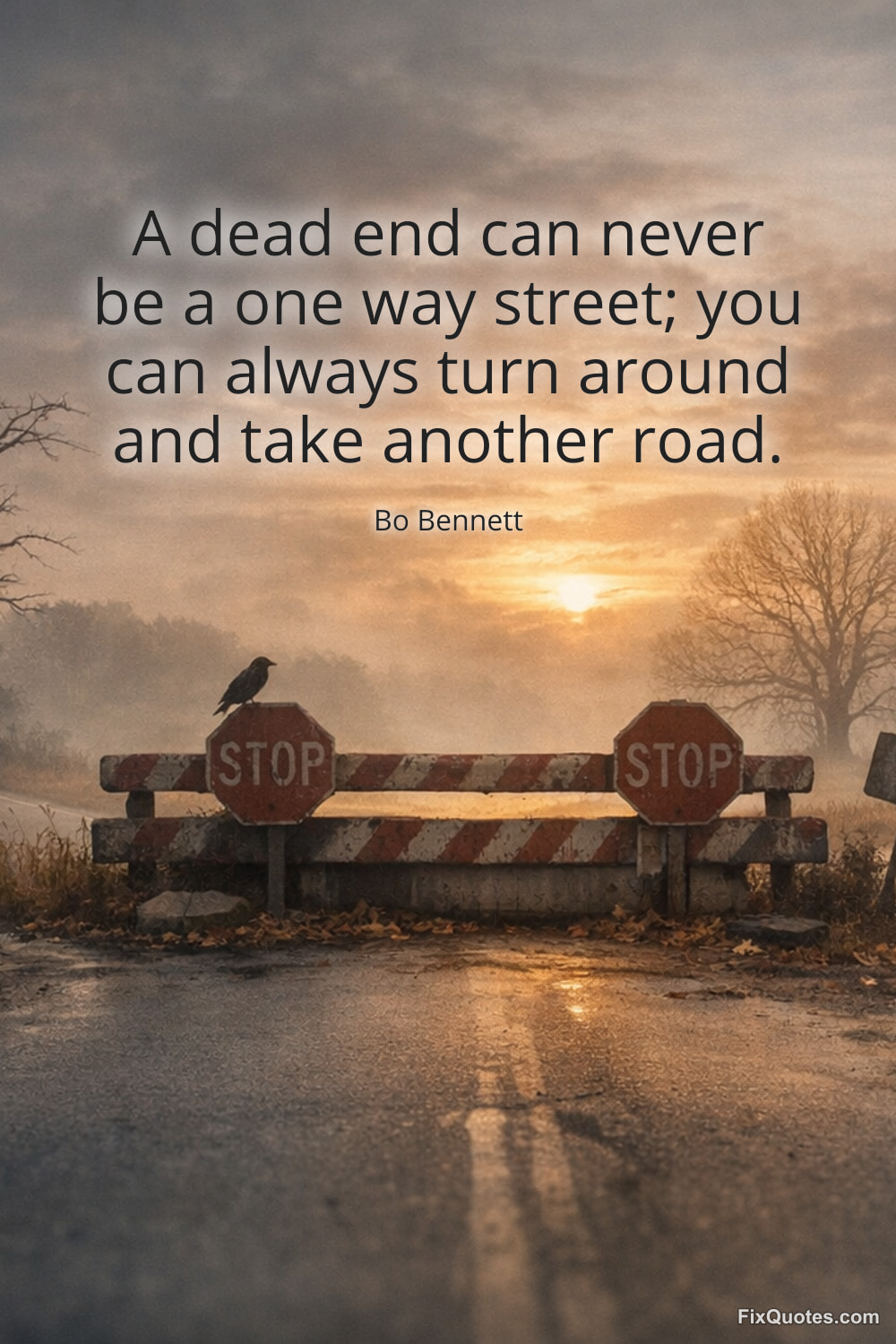 Bennett, Bo. "A dead end can never be a one way street; you can always turn around and take another road." FixQuotes. February 14, 2026. https://fixquotes.com/quotes/a-dead-end-can-never-be-a-one-way-street-you-can-40195/.