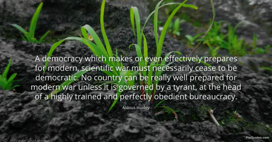 Huxley, Aldous. (2026, January 15). A democracy which makes or even effectively prepares for modern, scientific war must necessarily cease to be democratic. No country can be really well prepared for modern war unless it is governed by a tyrant, at the head of a highly trained and perfectly obedient bureaucracy. FixQuotes. https://fixquotes.com/quotes/a-democracy-which-makes-or-even-effectively-29669/