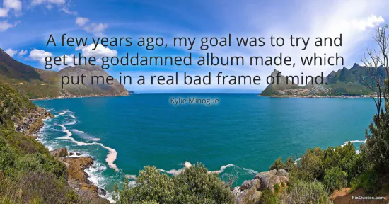 Minogue, Kylie. "A few years ago, my goal was to try and get the goddamned album made, which put me in a real bad frame of mind." FixQuotes. February 16, 2026. https://fixquotes.com/quotes/a-few-years-ago-my-goal-was-to-try-and-get-the-131254/.