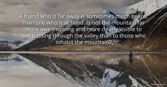 Gibran, Kahlil. (2026, January 15). A friend who is far away is sometimes much nearer than one who is at hand. Is not the mountain far more awe-inspiring and more clearly visible to one passing through the valley than to those who inhabit the mountain? FixQuotes. https://fixquotes.com/quotes/a-friend-who-is-far-away-is-sometimes-much-nearer-32303/