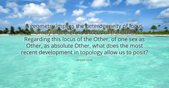 "A geometry implies the heterogeneity of locus, namely that there is a locus of the Other. Regarding this locus of the Other, of one sex as Other, as absolute Other, what does the most recent development in topology allow us to posit?" FixQuotes, 15 Jan. 2026, https://fixquotes.com/quotes/a-geometry-implies-the-heterogeneity-of-locus-154584/. Accessed 12 Feb. 2026.