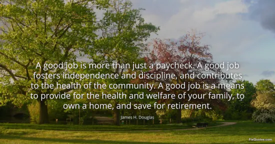 Douglas, James H. "A good job is more than just a paycheck. A good job fosters independence and discipline, and contributes to the health of the community. A good job is a means to provide for the health and welfare of your family, to own a home, and save for retirement." FixQuotes. January 16, 2026. https://fixquotes.com/quotes/a-good-job-is-more-than-just-a-paycheck-a-good-95438/.
