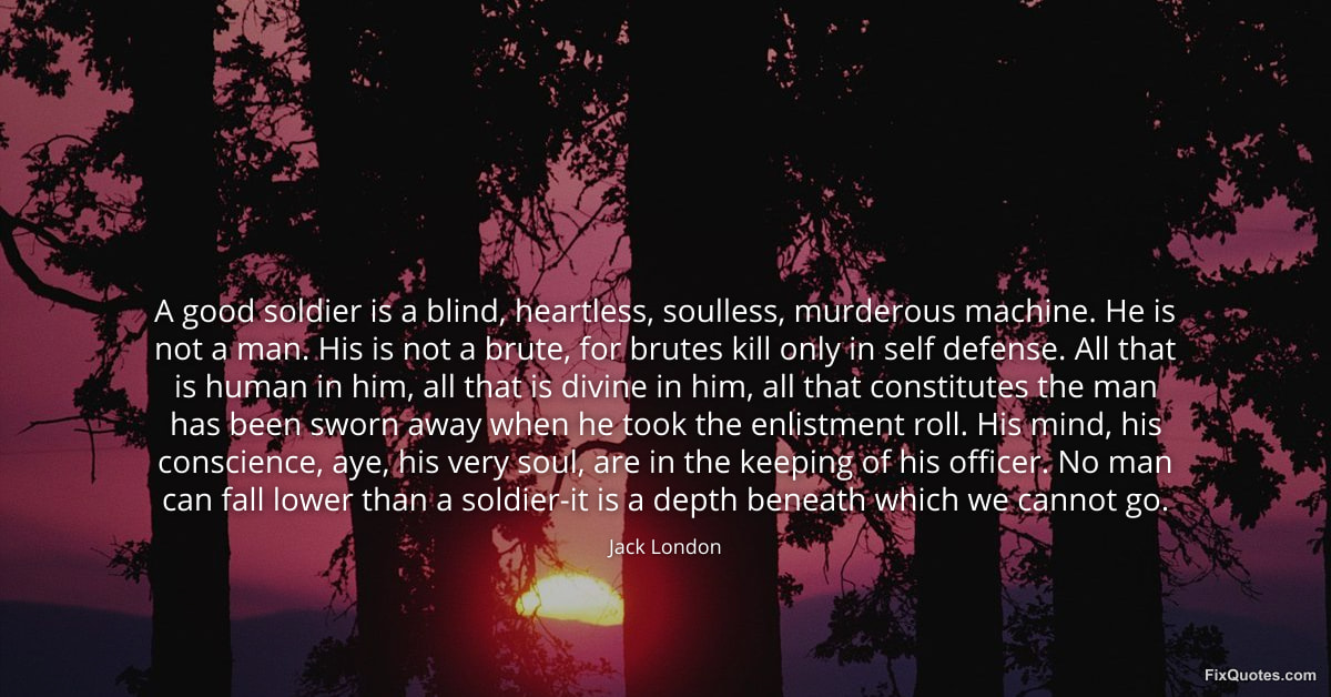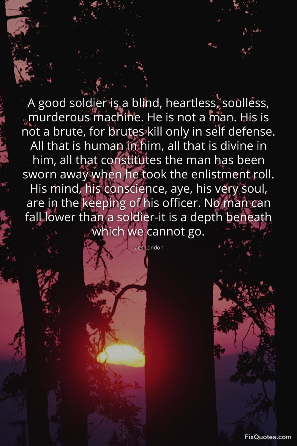 London, Jack. "A good soldier is a blind, heartless, soulless, murderous machine. He is not a man. His is not a brute, for brutes kill only in self defense. All that is human in him, all that is divine in him, all that constitutes the man has been sworn away when he took the enlistment roll. His mind, his conscience, aye, his very soul, are in the keeping of his officer. No man can fall lower than a soldier-it is a depth beneath which we cannot go." FixQuotes. January 15, 2026. https://fixquotes.com/quotes/a-good-soldier-is-a-blind-heartless-soulless-173109/.