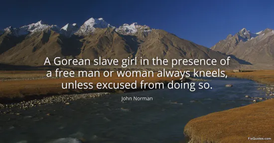 Norman, John. "A Gorean slave girl in the presence of a free man or woman always kneels, unless excused from doing so." FixQuotes. January 16, 2026. https://fixquotes.com/quotes/a-gorean-slave-girl-in-the-presence-of-a-free-man-123599/.