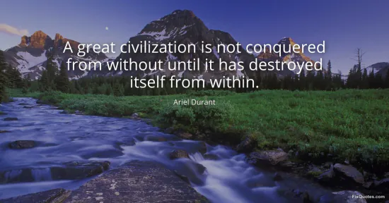 Durant, Ariel. "A great civilization is not conquered from without until it has destroyed itself from within." FixQuotes. January 15, 2026. https://fixquotes.com/quotes/a-great-civilization-is-not-conquered-from-33877/.