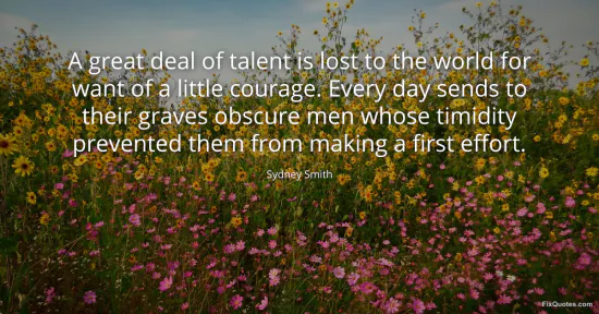 Smith, Sydney. (2026, January 15). A great deal of talent is lost to the world for want of a little courage. Every day sends to their graves obscure men whose timidity prevented them from making a first effort. FixQuotes. https://fixquotes.com/quotes/a-great-deal-of-talent-is-lost-to-the-world-for-10404/