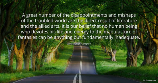 Hampton, Christopher. "A great number of the disappointments and mishaps of the troubled world are the direct result of literature and the allied arts. It is our belief that no human being who devotes his life and energy to the manufacture of fantasies can be anything but fundamentally inadequate." FixQuotes. January 17, 2026. https://fixquotes.com/quotes/a-great-number-of-the-disappointments-and-mishaps-66881/.