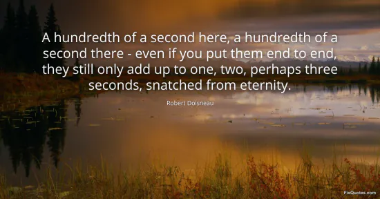 Doisneau, Robert. (2026, January 14). A hundredth of a second here, a hundredth of a second there - even if you put them end to end, they still only add up to one, two, perhaps three seconds, snatched from eternity. FixQuotes. https://fixquotes.com/quotes/a-hundredth-of-a-second-here-a-hundredth-of-a-136426/