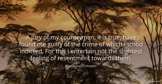 Meagher, Thomas Francis. "A jury of my countrymen, it is true, have found me guilty of the crime of which I stood indicted. For this I entertain not the slightest feeling of resentment towards them." FixQuotes. January 15, 2026. https://fixquotes.com/quotes/a-jury-of-my-countrymen-it-is-true-have-found-me-159772/.