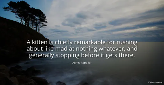 Repplier, Agnes. "A kitten is chiefly remarkable for rushing about like mad at nothing whatever, and generally stopping before it gets there." FixQuotes. January 15, 2026. https://fixquotes.com/quotes/a-kitten-is-chiefly-remarkable-for-rushing-about-171297/.