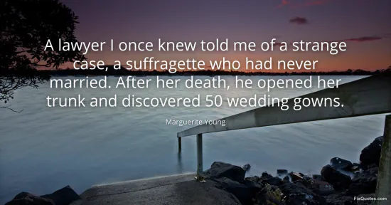 Young, Marguerite. (2026, January 17). A lawyer I once knew told me of a strange case, a suffragette who had never married. After her death, he opened her trunk and discovered 50 wedding gowns. FixQuotes. https://fixquotes.com/quotes/a-lawyer-i-once-knew-told-me-of-a-strange-case-a-69499/