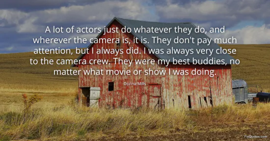 Mills, Donna. (2026, January 17). A lot of actors just do whatever they do, and wherever the camera is, it is. They don't pay much attention, but I always did. I was always very close to the camera crew. They were my best buddies, no matter what movie or show I was doing. FixQuotes. https://fixquotes.com/quotes/a-lot-of-actors-just-do-whatever-they-do-and-50518/