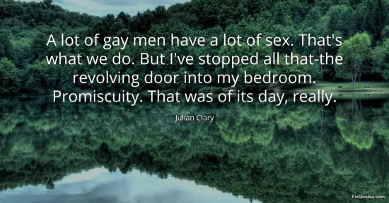 Clary, Julian. "A lot of gay men have a lot of sex. That's what we do. But I've stopped all that-the revolving door into my bedroom. Promiscuity. That was of its day, really." FixQuotes. January 18, 2026. https://fixquotes.com/quotes/a-lot-of-gay-men-have-a-lot-of-sex-thats-what-we-4826/.