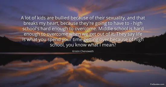 Chenoweth, Kristin. (2026, January 15). A lot of kids are bullied because of their sexuality, and that breaks my heart, because they're going to have to - high school's hard enough to overcome. Middle school is hard enough to overcome when we get out of it. They say life is what you spend your time getting over because of high school, you know what I mean? FixQuotes. https://fixquotes.com/quotes/a-lot-of-kids-are-bullied-because-of-their-135681/