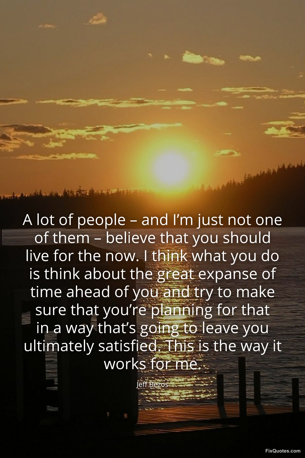 Bezos, Jeff. (2026, March 25). A lot of people – and I’m just not one of them – believe that you should live for the now. I think what you do is think about the great expanse of time ahead of you and try to make sure that you’re planning for that in a way that’s going to leave you ultimately satisfied. This is the way it works for me. FixQuotes. https://fixquotes.com/quotes/a-lot-of-people-and-im-just-not-one-of-them-186389/