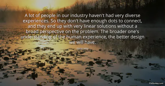 Jobs, Steve. (2026, January 17). A lot of people in our industry haven't had very diverse experiences. So they don't have enough dots to connect, and they end up with very linear solutions without a broad perspective on the problem. The broader one's understanding of the human experience, the better design we will have. FixQuotes. https://fixquotes.com/quotes/a-lot-of-people-in-our-industry-havent-had-very-24984/