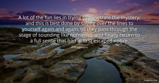 Hecht, Anthony. "A lot of the fun lies in trying to penetrate the mystery; and this is best done by saying over the lines to yourself again and again, till they pass through the stage of sounding like nonsense, and finally return to a full sense that had at first escaped notice." FixQuotes. January 15, 2026. https://fixquotes.com/quotes/a-lot-of-the-fun-lies-in-trying-to-penetrate-the-41959/.