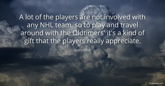 Lafleur, Guy. "A lot of the players are not involved with any NHL team, so to play and travel around with the Oldtimers' it's a kind of gift that the players really appreciate." FixQuotes. January 17, 2026. https://fixquotes.com/quotes/a-lot-of-the-players-are-not-involved-with-any-54897/.