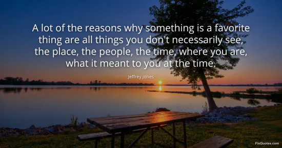 Jones, Jeffrey. "A lot of the reasons why something is a favorite thing are all things you don't necessarily see, the place, the people, the time, where you are, what it meant to you at the time." FixQuotes. January 16, 2026. https://fixquotes.com/quotes/a-lot-of-the-reasons-why-something-is-a-favorite-86178/.
