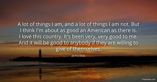 Dean, Jimmy. (2026, January 16). A lot of things I am, and a lot of things I am not. But I think I'm about as good an American as there is. I love this country. It's been very, very good to me. And it will be good to anybody if they are willing to give of themselves. FixQuotes. https://fixquotes.com/quotes/a-lot-of-things-i-am-and-a-lot-of-things-i-am-not-119517/
