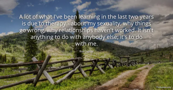 George, Boy. "A lot of what I've been learning in the last two years is due to therapy - about my sexuality, why things go wrong, why relationships haven't worked. It isn't anything to do with anybody else; it's to do with me." FixQuotes. January 15, 2026. https://fixquotes.com/quotes/a-lot-of-what-ive-been-learning-in-the-last-two-45467/.