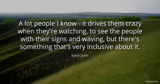 "A lot people I know - it drives them crazy when they're watching, to see the people with their signs and waving, but there's something that's very inclusive about it." FixQuotes, 16 Jan. 2026, https://fixquotes.com/quotes/a-lot-people-i-know-it-drives-them-crazy-when-86909/. Accessed 12 Feb. 2026.