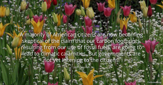 Coleman, John. "A majority of American citizens are now becoming skeptical of the claim that our carbon footprints, resulting from our use of fossil fuels, are going to lead to climatic calamities. But governments are not yet listening to the citizens." FixQuotes. January 15, 2026. https://fixquotes.com/quotes/a-majority-of-american-citizens-are-now-becoming-167789/.