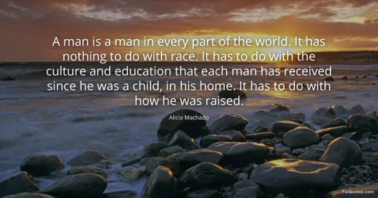 Machado, Alicia. (2026, January 15). A man is a man in every part of the world. It has nothing to do with race. It has to do with the culture and education that each man has received since he was a child, in his home. It has to do with how he was raised. FixQuotes. https://fixquotes.com/quotes/a-man-is-a-man-in-every-part-of-the-world-it-has-63508/