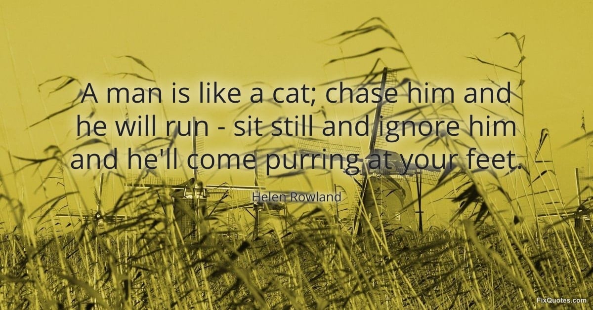 Rowland, Helen. (2026, January 15). A man is like a cat; chase him and he will run - sit still and ignore him and he'll come purring at your feet. FixQuotes. https://fixquotes.com/quotes/a-man-is-like-a-cat-chase-him-and-he-will-run-31422/