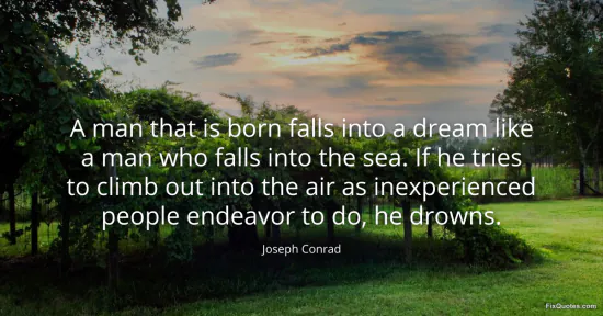 Conrad, Joseph. (2026, January 16). A man that is born falls into a dream like a man who falls into the sea. If he tries to climb out into the air as inexperienced people endeavor to do, he drowns. FixQuotes. https://fixquotes.com/quotes/a-man-that-is-born-falls-into-a-dream-like-a-man-92069/