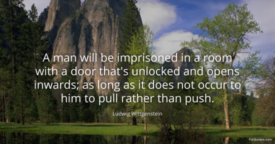 Wittgenstein, Ludwig. "A man will be imprisoned in a room with a door that's unlocked and opens inwards; as long as it does not occur to him to pull rather than push." FixQuotes. January 14, 2026. https://fixquotes.com/quotes/a-man-will-be-imprisoned-in-a-room-with-a-door-577/.