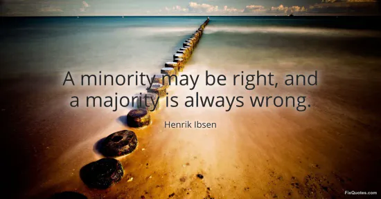 The provocation lies in the word always. Ibsen writes drama, not a treatise, and he heightens the claim to expose how communities protect their myths. A new idea normally begins as a minority position, carried by a few stubborn individuals willing to accept loss and ridicule. If truth is bound to initial unpopularity, then moral courage requires standing against the warm tide of agreement. The minority may be right precisely because it has not yet been rewarded for conforming.