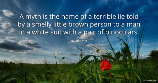 Antin, David. "A myth is the name of a terrible lie told by a smelly little brown person to a man in a white suit with a pair of binoculars." FixQuotes. January 17, 2026. https://fixquotes.com/quotes/a-myth-is-the-name-of-a-terrible-lie-told-by-a-64997/.